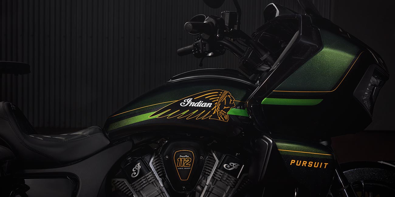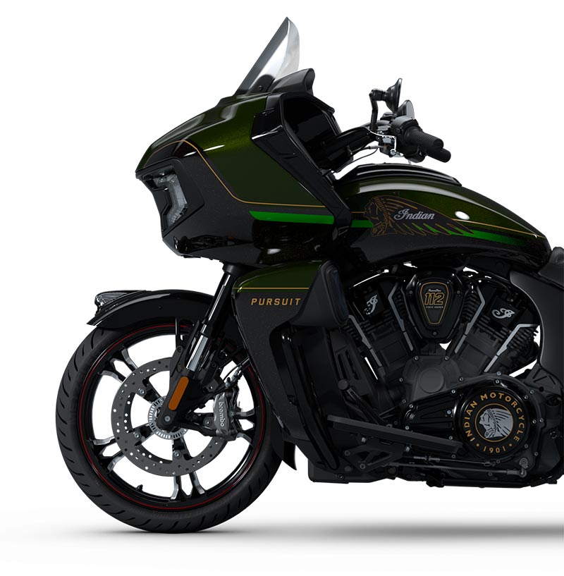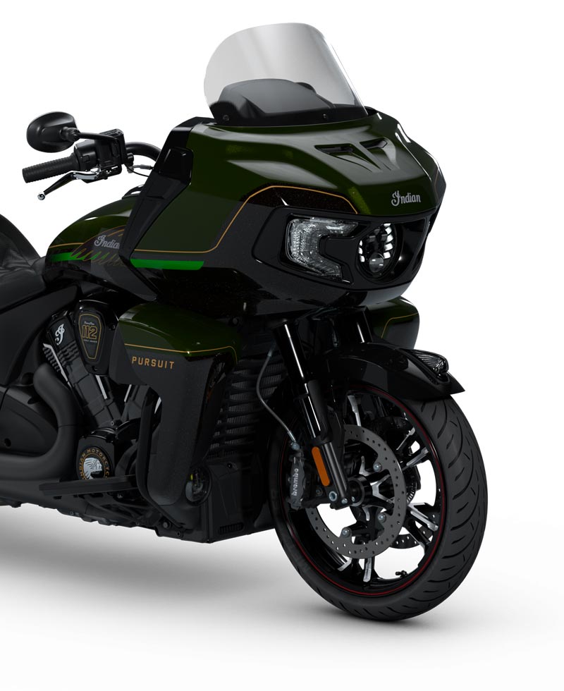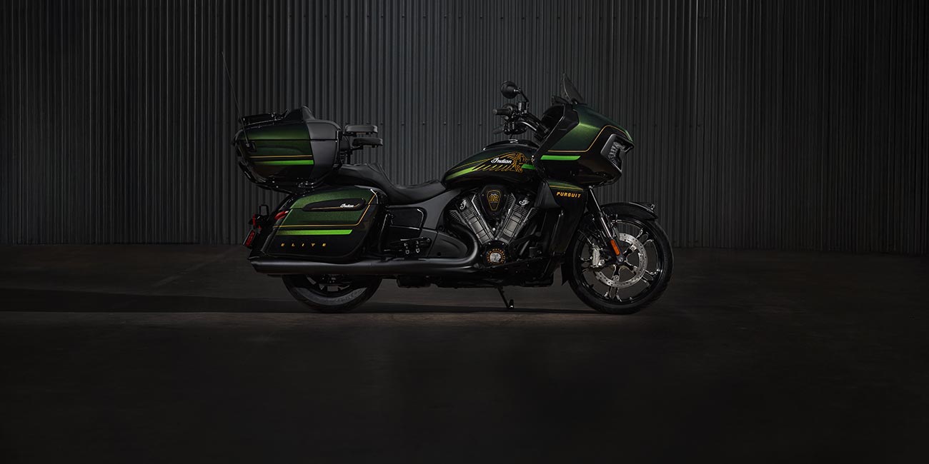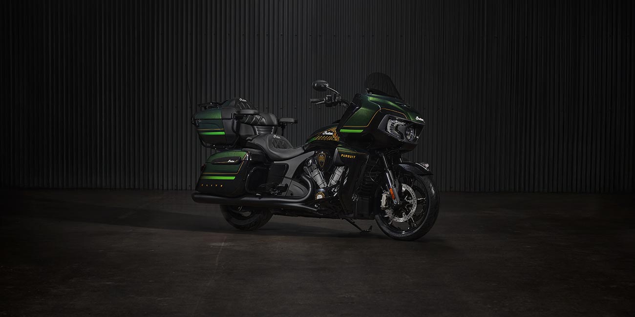 | Standardní vybavení | Dálkové zamykání kufrů, elektricky nastavitelné čelní sklo, 140+ litrů úložného prostoru, bezklíčové zapalování, nastavitelné větrací otvory kapotáže, USB nabíječka, systém monitorování tlaku v pneumatikách (TPMS), premiové stupačky s logem Indian Motorcycle, barevně sladěná, zeleně prošívaná vyhřívaná sedadla, podsvícené ovladače na řídítkách s vyhřívanými rukojeťmi, loketní opěrky spolujezdce a přídavná světla |